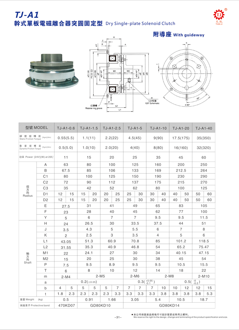 天機(jī)傳動片式摩擦電磁離合器附導(dǎo)座TJ-A1型由銜鐵(電樞板)、定子、轉(zhuǎn)子、板型彈簧片、磁性線圈、來令片、鋁導(dǎo)座等元件構(gòu)成,統(tǒng)一使用DC24V,標(biāo)準(zhǔn)規(guī)格0.6-40KG。