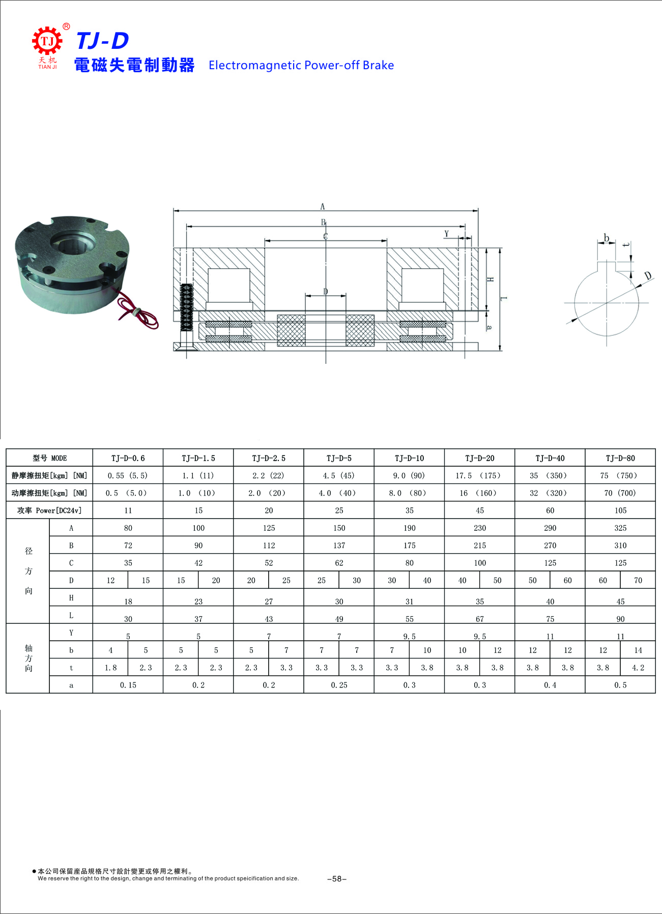天機傳動電磁失電制動器(TJ-D)的安裝尺寸及規(guī)格參數(shù)如下: