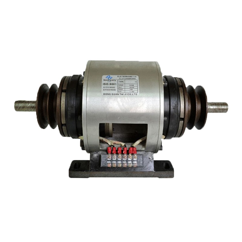 雙電磁離合器剎車器組合體(附皮帶輪)由兩個TL-A型電磁離合器與一個 TL-B型電磁剎車器組成的集成體。兩個電磁離合器裝置在左右兩端,電磁制動器裝置在外殼內部,三者連成一體。離合器的轉子被電磁制動器則固定在出力軸上,從而使用雙側的離合器軸承凸輪被解鑲在出力軸上。當右側的電磁離合器電流通過時,離合器軸承凸輪帶動出力軸,不通電的時候,軸承凸輪與出力軸處于分離狀態(tài),剎車器通電時出力軸停止動作。當左側電磁離合器接通中流時,那么左側的軸承凸輪帶動出力軸,切斷電流時,左側的電磁離合器凸輪會與出力軸處于切離狀態(tài)。通過以上的工作原理可以看出,此型雙電磁離合剎車組適用于二段變速定位停止、高頻率正逆轉、動力分配精確定位的傳動組合。雙電磁離合器剎車組合體廣泛應用于電線電纜機械設備行業(yè)居多。