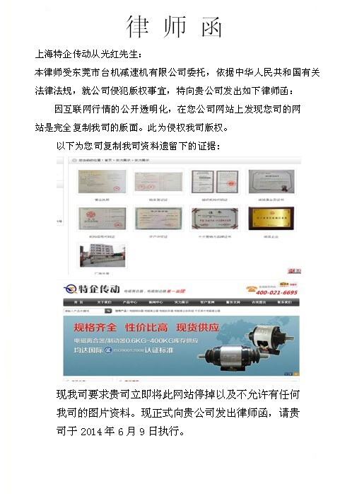 上海特企傳動(dòng)復(fù)制我司網(wǎng)站的版面,侵犯我司版權(quán)。依據(jù)中華人民共和國(guó)有關(guān)法律法規(guī),2014年6月9號(hào)我司向上海特企傳動(dòng)發(fā)出律師函,要求上海特企立即停止網(wǎng)站的運(yùn)行以及去掉我司的圖片資料。